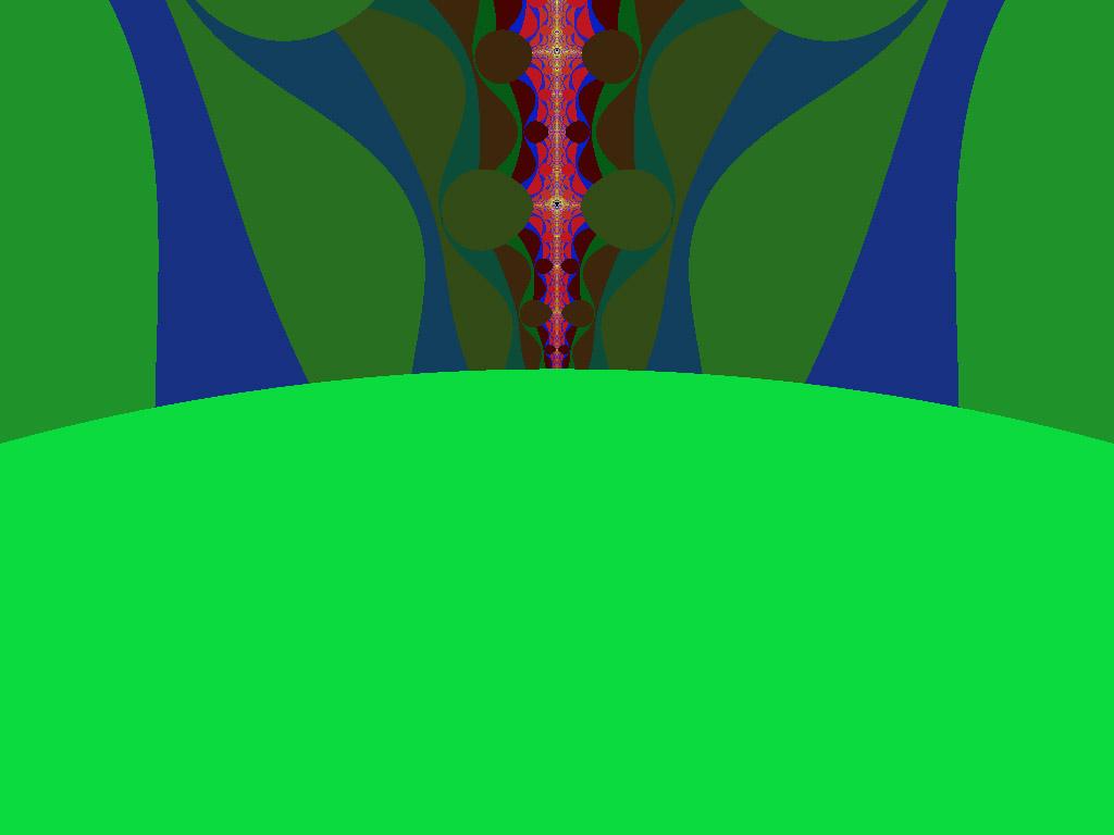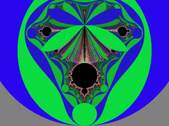 This largest circular form is recessed especially far from the edge of the repeller sets out on the spike, at the extreme. The edge of the disc is flush with the edge of the Set so that it just obscures the final extent of the spike itself, and meets the repeller sets at the far end. As with the other circular objects, it is at a favorable energy level with respect to its surroundings. In other words, it requires fewer calculations and less energy to resolve, or maintain, this form than those areas of the repeller sets which it overlies, or the Set itself. It is exceptional, however, in that it completely obscures the spike, and all of the other circular forms around the periphery leave a small region of the higher-iterated areas exposed on the side away from the edge of the M-set. So; it would seem that we are cut off from some kinds of knowledge, either by nature, or by what our calculational process has revealed. Or are we?