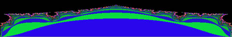 The border of a fractal is the very embodiment of the stretching of space, and the Mandelbrot Set demonstrates this quite clearly. It encloses a finite area and yet the length of the boundary is much larger than a circle of the same area. Also, it's apparent boundary grows as the size of one's measuring rod diminishes. The perimiter of the outer circle is easy to calculate, but each color band further inward is more and more convoluted, and it becomes hard to measure the perimeter exactly, very much like many natural coastlines. Although the building of form proceeds smoothly from one color band (denoting the repeller sets) to the next, in the manner of smooth waves building upon each other, the cumulative effect results in areas where the edge is folded back upon itself. It should be noted that the outer bands are forms which can be resolved in a few calculations, and they are simple shapes with relatively smooth outlines. As one proceeds inward, the shapes become more articulated, and their features require many more calculations to resolve.